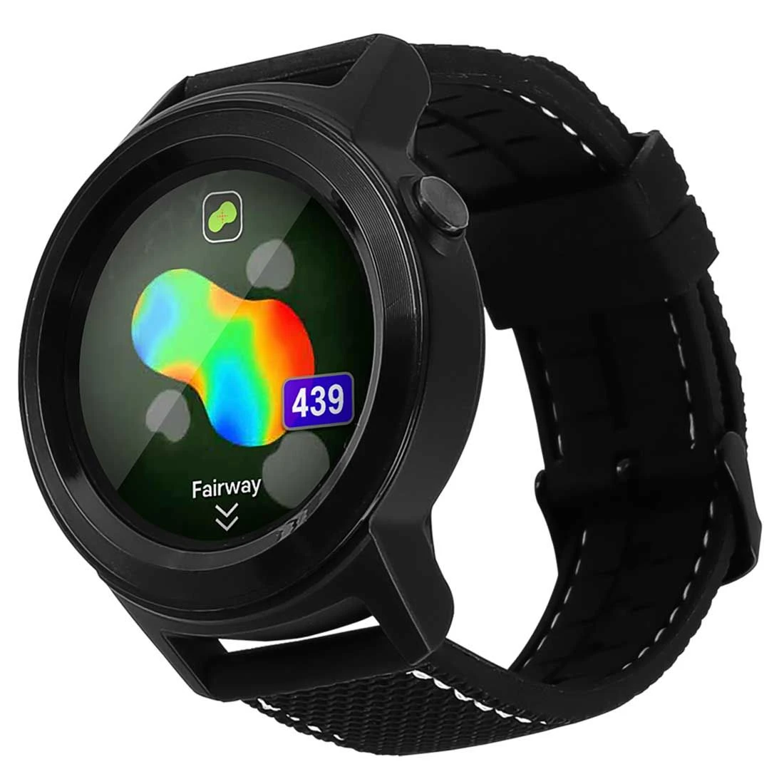 The aim W11 GPS Golf Watch provides accurate distance measurements, with a 1.3โ TFT-LCD color touch screen that provides distance calculations to the front, center and back of the green, and distances to targets and hazards. The watch automatically recognizes which hole you are playing and has manual pin placement, digital scorecard and a rechargeable lithium-ion battery which lasts up to 13 hours in golf mode.